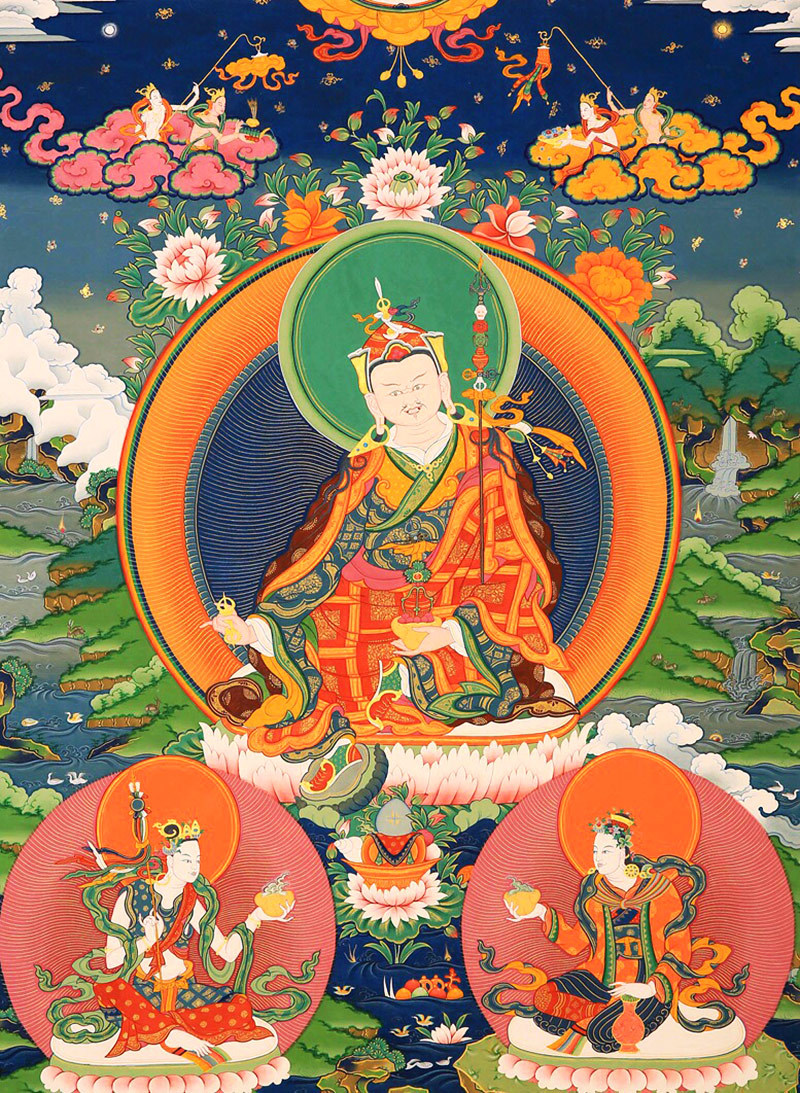 公元八世纪,应藏王赤松德赞迎请入藏弘法,并与堪布菩提萨埵建立桑耶寺。他还教导藏族弟子学习译经,发展在家、出家两种僧团制,开创了藏传佛教。莲花生大师为修行极高的瑜伽士,有两位弟子亦是明妃伴其左右,左侧为明妃曼达拉娃,右侧原本是赤松德赞的妃子益西措杰。
