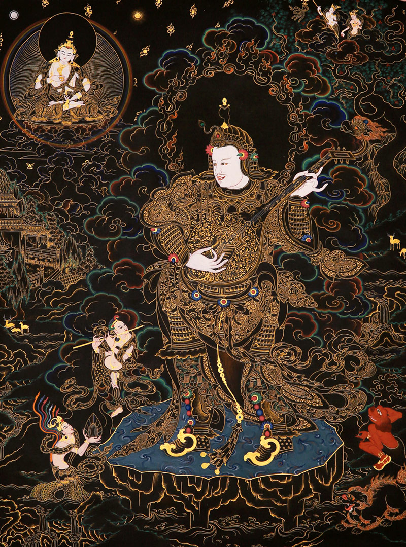 “持国”意为慈悲为怀,保护众生,护持国土,故名持国天王。住须弥山黄金埵,身为白色,穿甲胄,手持琵琶,是帝释天的主乐神,率领毗舍离、乾达婆诸神将,表明他要用音乐来使众生皈依佛教,他负责守护东胜神州,是“二十诸天”中的第四天王。