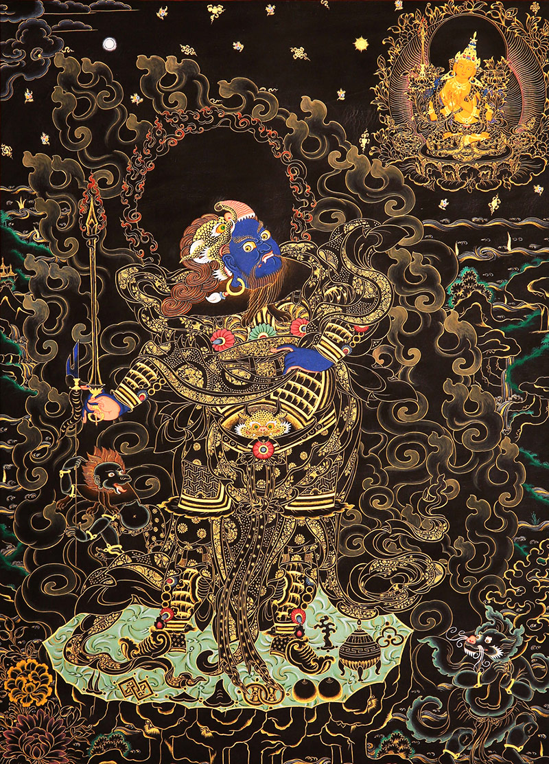 佛教的四大天王,亦称“护世四天王”,有各自的名称和形象,各守一方。此幅唐卡主尊乃南方天王毗琉璃,汉译“增长”,意指能令他人善根增长,塑像身青色,手持宝剑,率领鸠槃荼(雍形鬼)、薛荔(饿鬼)诸神将,保护南方阎浮提洲人民,手中宝剑,用来保护佛法,不受侵犯。