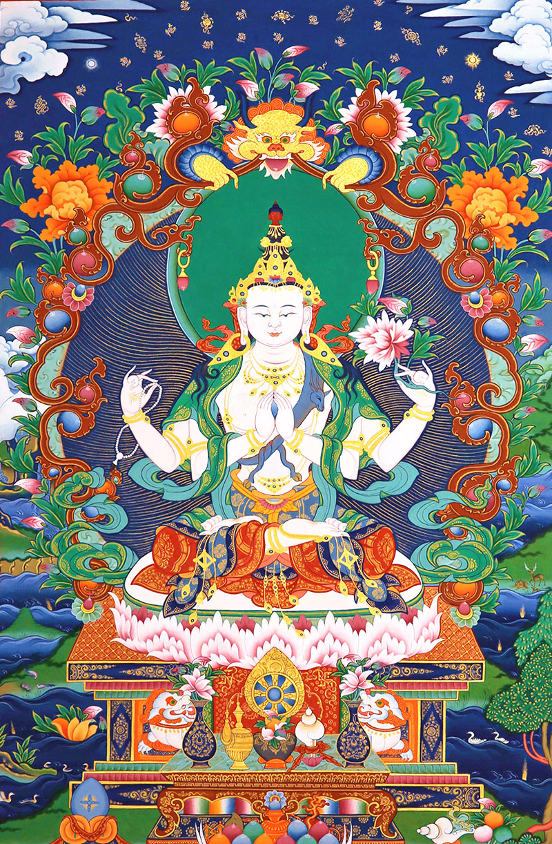 四臂观音本尊身颜洁白如月,头戴五佛冠,发黑色结髻,中央二手合掌於胸前,捧有摩尼宝珠,右手持水晶念珠。左手拈八瓣莲花与耳际齐,面貌寂静含笑。以菩萨慧眼凝视众生,凡被其观者尽得解脱。全身花蔓庄严,双跏趺坐於莲花月轮上,身发极大五彩光,明朗照耀。
