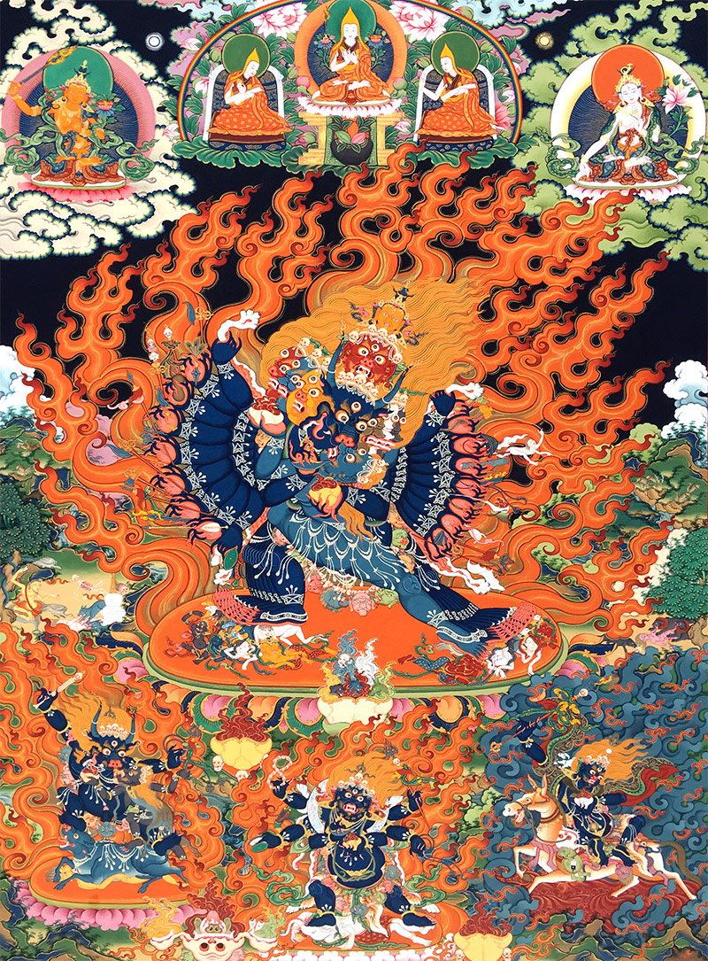 文殊菩萨的忿怒化身大威德金刚像,因其能降服恶魔,故称大威,又有护善之功,故又称大德。