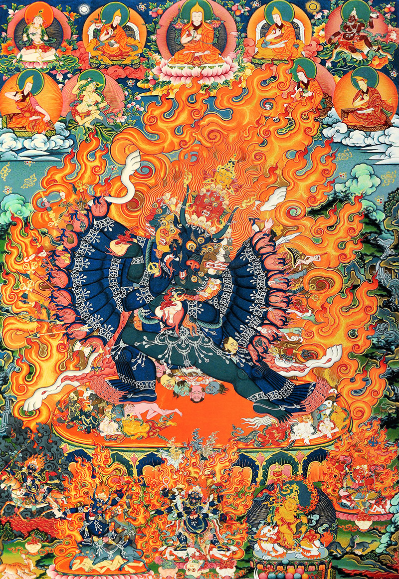 大威德金刚是文殊菩萨的忿怒化身, 由于本尊威德极大, 能制伏毒龙、断除诸障,对治阎罗死魔等,因此亦称降阎魔尊。 本尊顶上为文殊菩萨现寂静像,上左为多闻天王毗沙门天,上右为黄财神藏巴拉,均为本尊之护法;下左为本尊之不共护法阎摩法王(当金却甲),也是下士道之护法。 下中为内供,五妙欲供,朵玛供等本尊之供品。