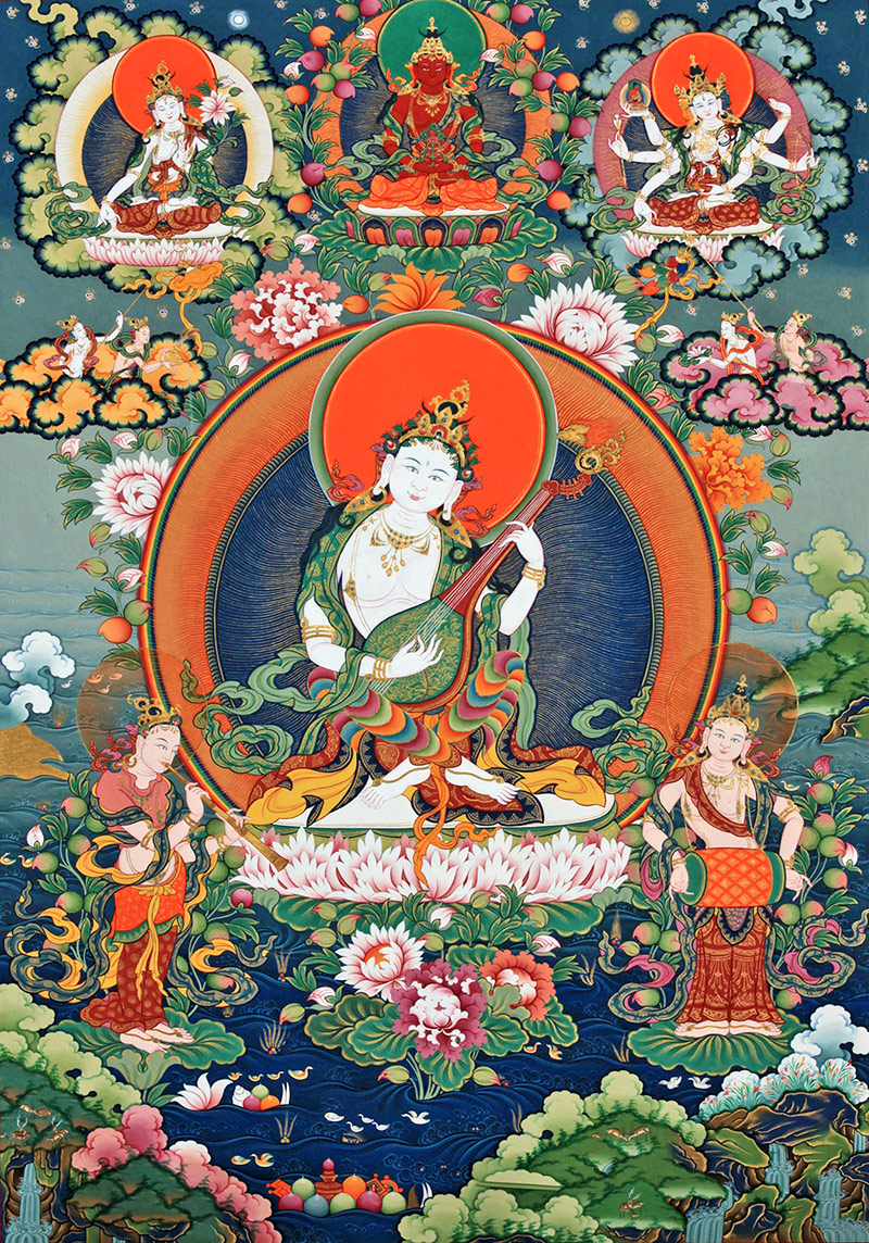 唐卡中的妙音佛母,相貌如同十六岁的美丽少女,温柔而庄严。 佛母身前,是两位主司音乐之眷属,各持不同的乐器在演奏,种种乐音,都能开启人之智慧。唐卡的上方是长寿三尊,依次是白度母、无量寿佛(长寿佛)、尊胜佛母,此三尊是赐予人们吉祥长寿的本尊。