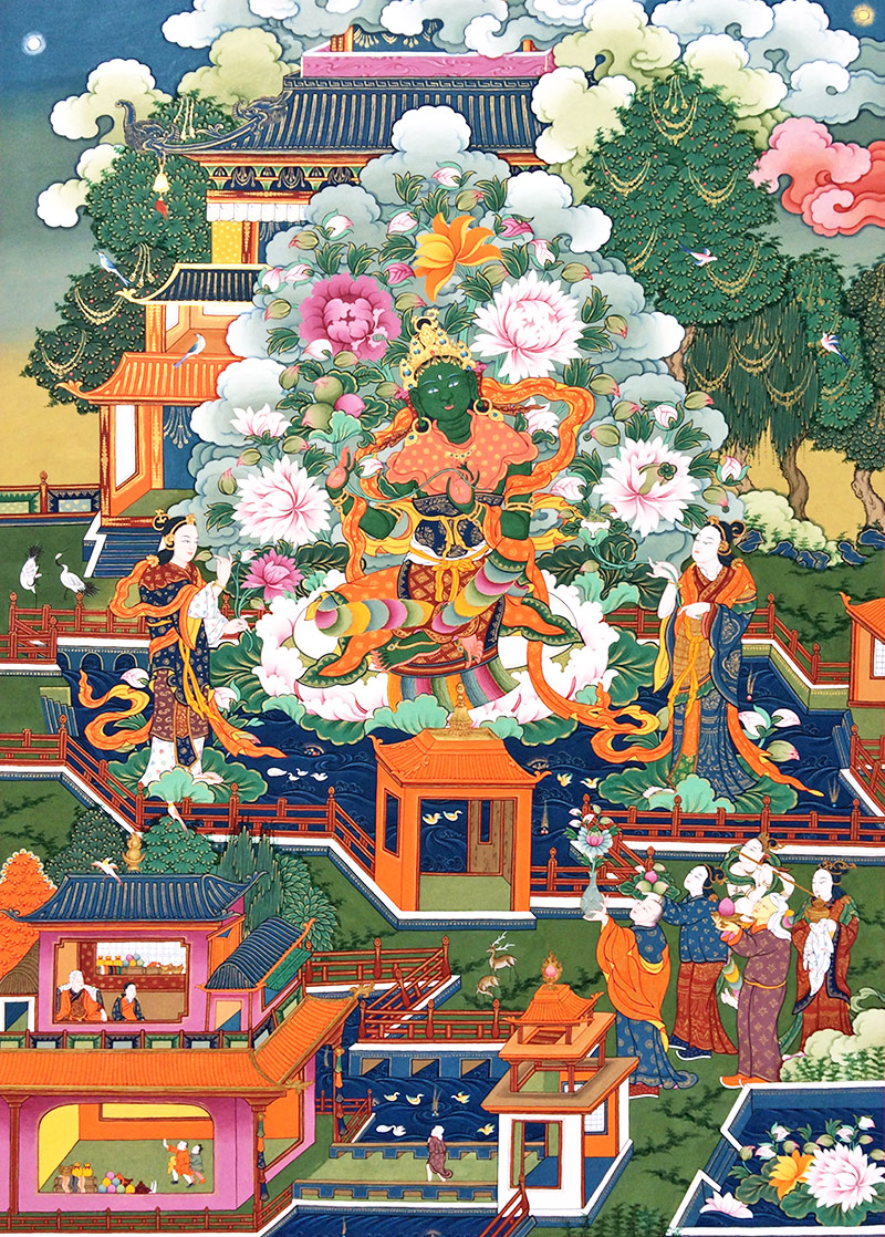 绿度母为观世音菩萨的化身。度母,梵名Tara,全称圣救度佛母,我国古代称多罗菩萨、多罗观音,度母有许多不同的化现,包括有二十一度母、五百度母等等,皆为观世音菩萨之化身,而绿度母为所有度母之主尊,总摄其余二十尊化身之所有功德。