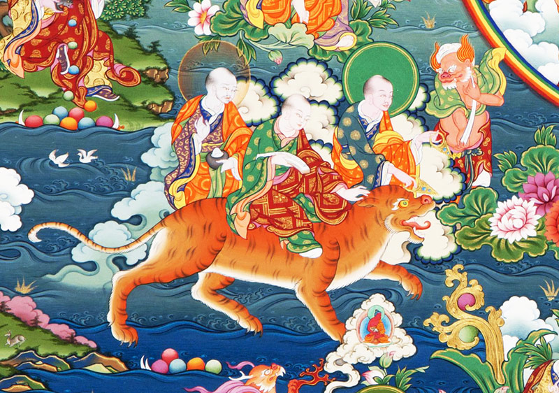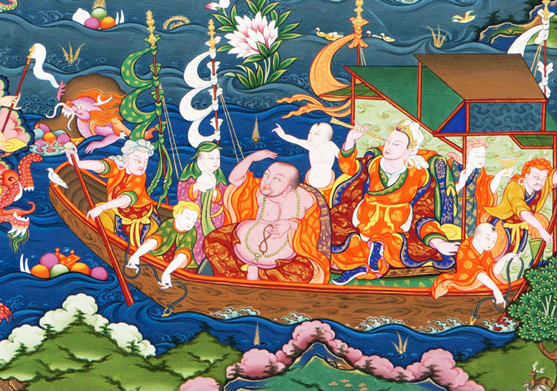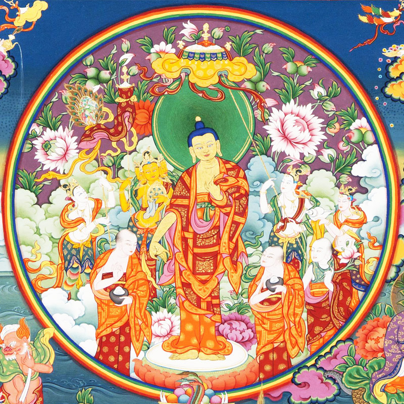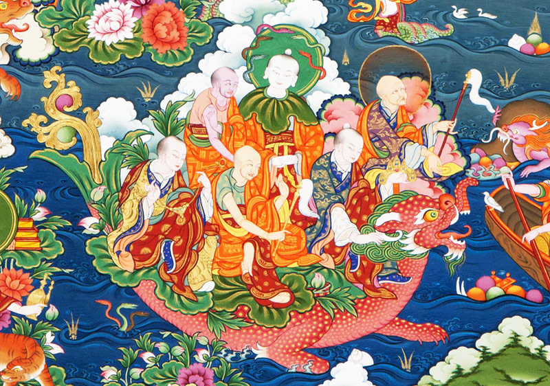 释迦牟尼佛曾令十六罗汉常驻人间,普渡众生。且意为,一切名言概念包括各类事物、现象、境界、特性、概念等都像乘筏渡水、渡罢舍筏一样,仅是权宜之计、方便之用,绝不可心怀观想,去计较,去费心思。正如《金刚经》里的四句偈:一切有为法,如梦幻泡影,如露亦如电,应作如是观。