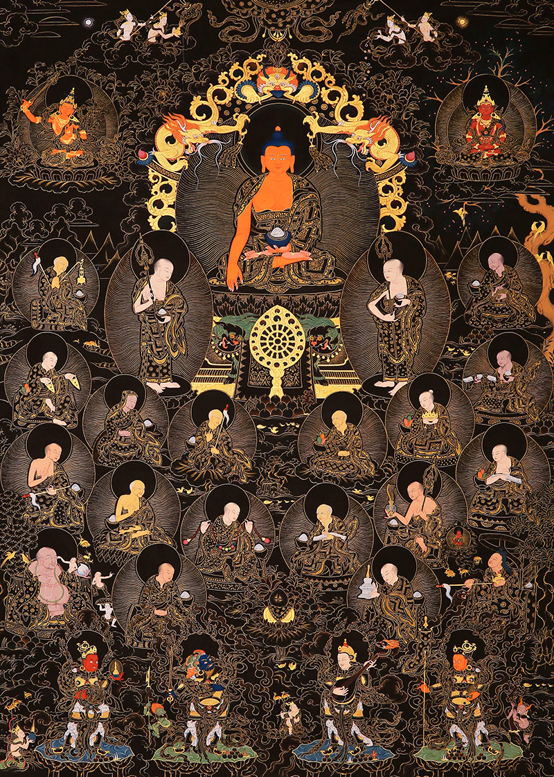 中央主尊为释迦牟尼佛与其二弟子,周围为传统所说的十八罗汉。罗汉,是阿罗汉的简称,梵名(Arhat),罗汉者皆身心六根清静,无名烦恼已断,了脱生死,证入涅槃。堪受诸人天尊敬供养。于寿命未尽前,仍住世间梵行少欲,戒德清静,随缘教化渡众。唐代《法住记》载,十六尊罗汉乘佛敕命,永驻世间守护正法,唐卡中的十八罗汉,即十六罗汉外再加绘上达摩多罗尊者与布袋和尚。下方为四大天王造型。