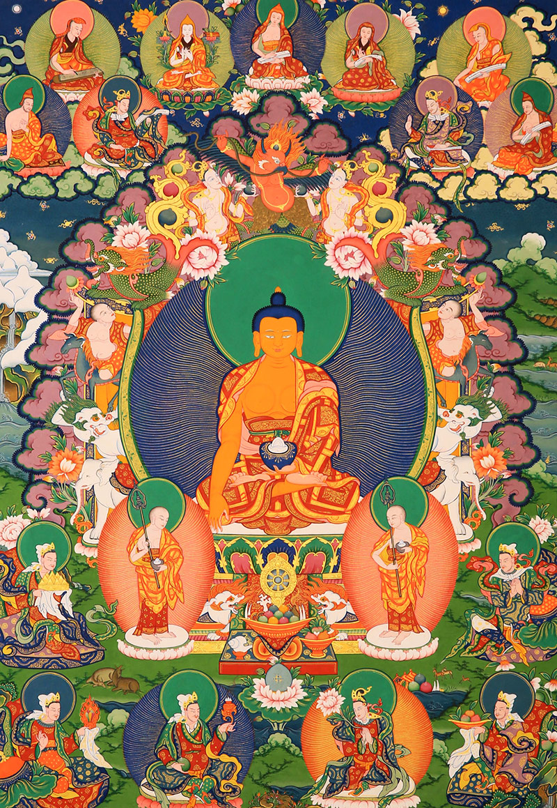 唐卡中央释迦牟尼佛与左右侍立舍利弗与目犍连两大弟子,环周有藏密大师、梵天、帝释天及眷属以及其父净饭王、母摩耶夫人等手持各宝、花、香、果等供养而作供养。唐卡的上方,是堪称印度与雪域庄严的各大论师,法师等,有阿底峡尊者、宗喀巴大师等。