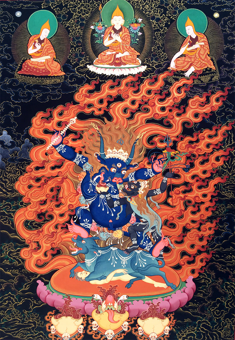 阎摩法王护法,是文殊菩萨的化身,也是大威德金刚的不共护法,能护持行者生起出离心,并且不受寿难,命难等违缘干扰,获得自在如意的成就。